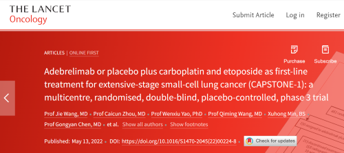 北京时间2022年5月14日,AG旗舰厅医药自主研发的PD-L1抑制剂阿得贝利单抗治疗广泛期小细胞肺癌的III期临床研究(CAPSTONE-1研究)成果正式全文在线发表于国际权威学术期刊《柳叶刀·肿瘤学》(《THE LANCET Oncology》,影响因子41.316)。CAPSTONE-1研究结果显示,阿得贝利单抗联合化疗一线治疗广泛期小细胞肺癌相较于安慰剂联合化疗可以显著延长患者总生存期至15.3个月[1],刷新现有免疫药物一线治疗广泛期小细胞肺癌的总生存纪录[2]。