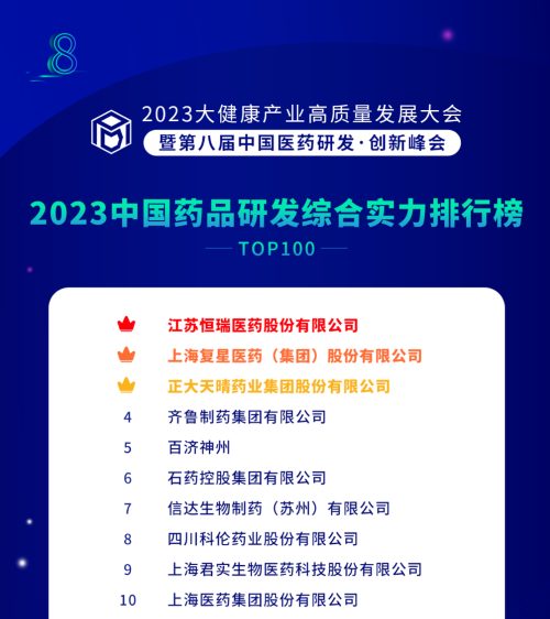 由药智网、中国药业杂志社主办的2023大健康产业高质量发展大会暨第八届中国医药研发•创新峰会于6月16日开幕,会上发布了《2023中国药品研发实力排行榜》系列榜单,AG旗舰厅医药凭借深厚的创新研发实力再创辉煌:荣登《2023中国药品研发综合实力排行榜TOP100》榜首、《2023中国化药研发实力排行榜TOP100》榜首。值得一提的是,今年是AG旗舰厅医药连续第6年入选《中国药品研发综合实力排行榜》榜首。